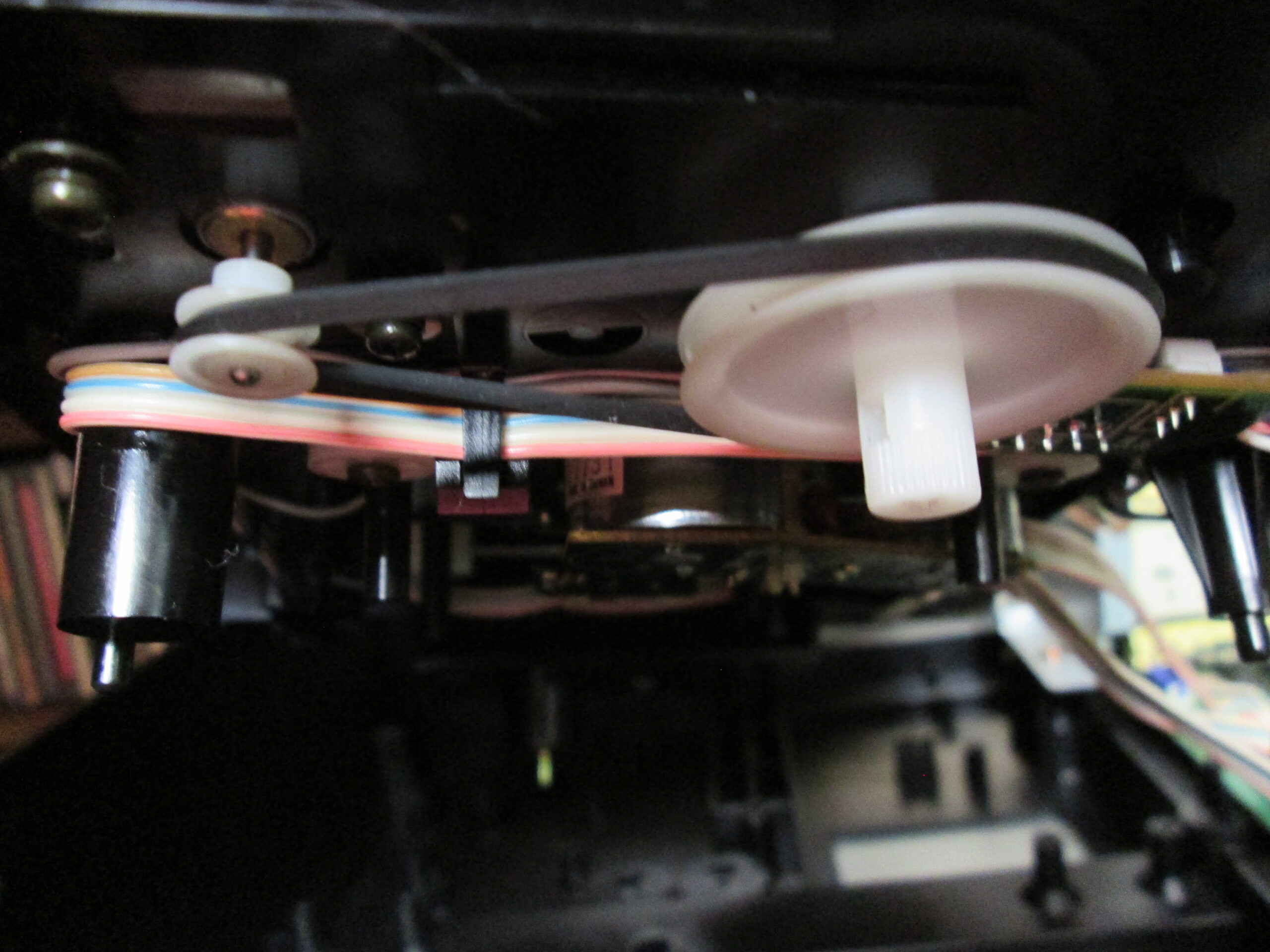 With the front cover removed it was possible to see the drawer drive belt for the machine. You would think that it is easy to remove and replace the belt. Unfortunately, there is an extra step involved.