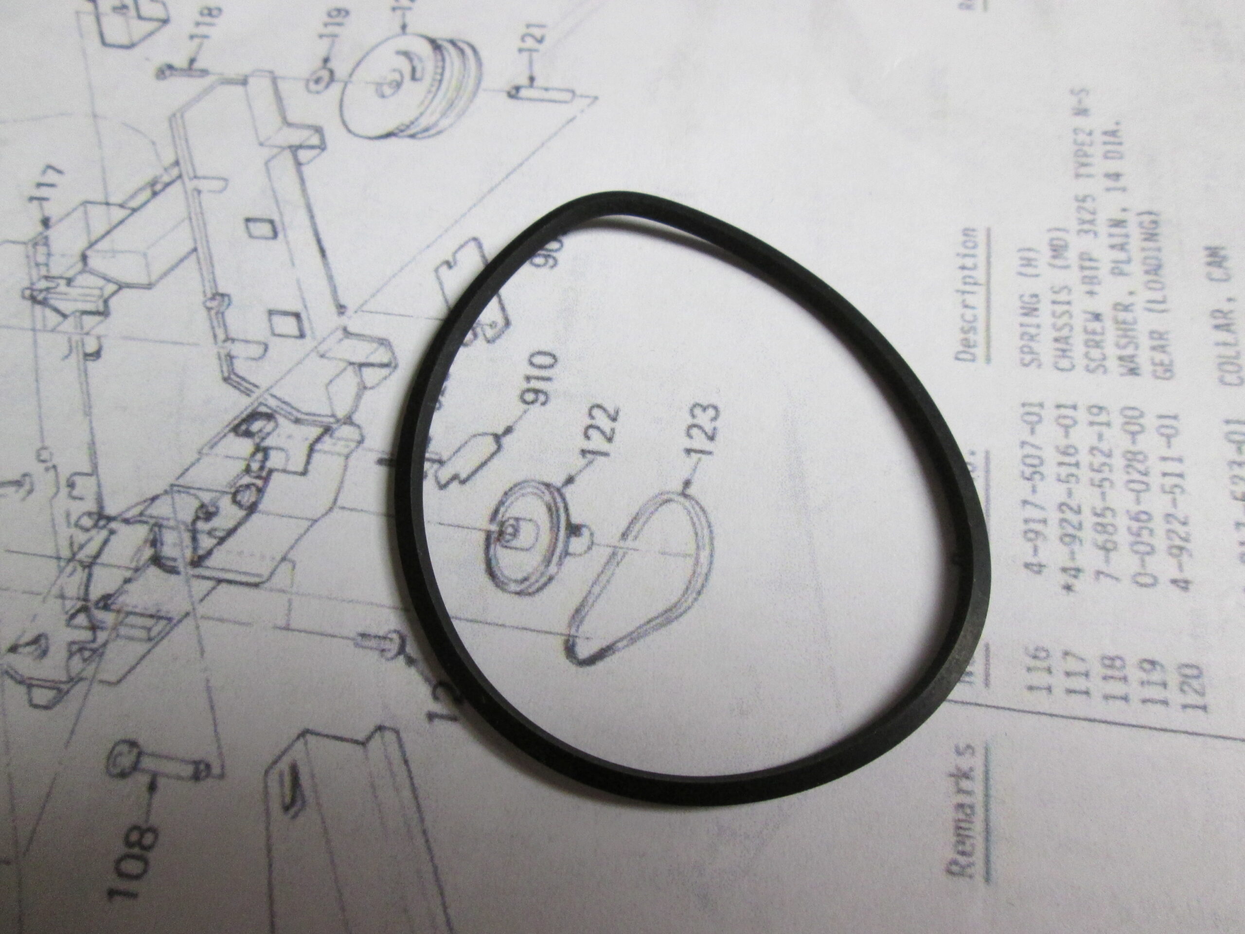 What is the difference between a good drive belt and a bad one? The photo on the right shows the old drive belt after it has been removed from the CDP-750. Notice that it is not circular, and has taken on a deformation that matches both the large curve of the big drawer pully and the curve of the smaller pully that is attached to the drive motor.