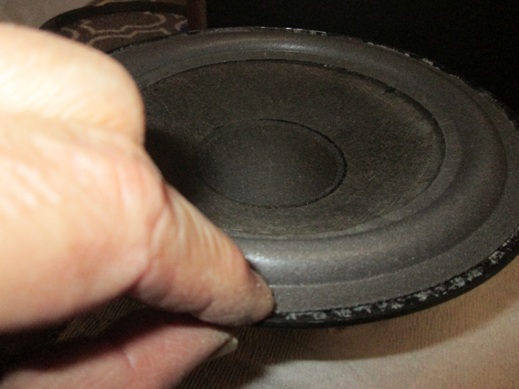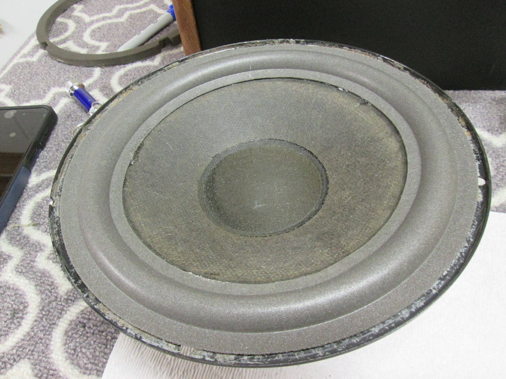Be sure to follow the instructions carefully. A mistake can be costly. You will have to remove the remnants of the old foam and glue from the paper cone and the metal frame. Then you need to install the new foam in the proper manner. It isn’t hard, but it can be tedious. In this photo we see the foam ring glued to the paper cone, but not yet attached to the metal frame of the woofer.
