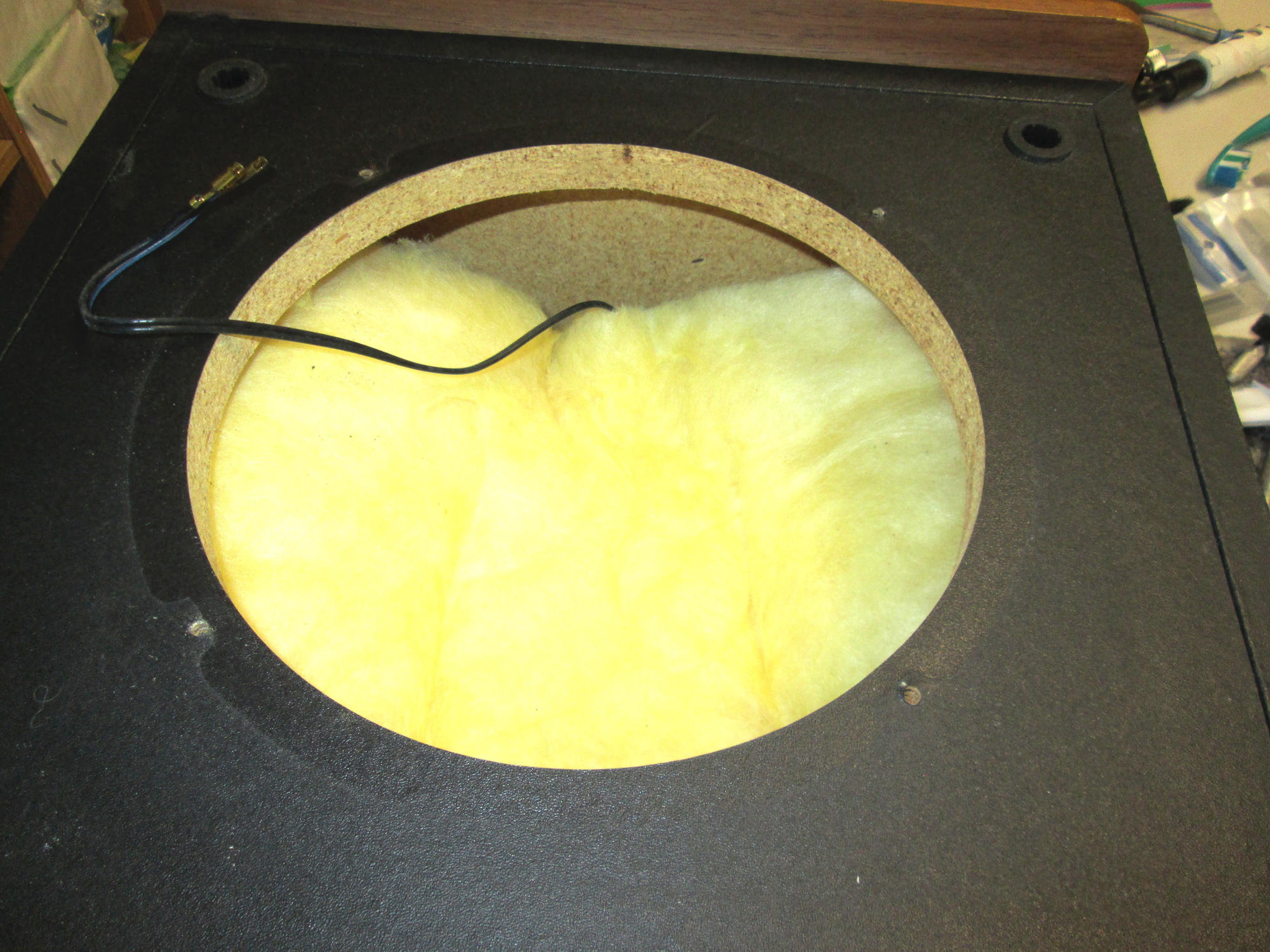 The inside of the typical speaker cabinet is rather unimpressive. Here we see the wire that connects the electronic crossover to the woofer and the anti-echo-reverb-and-icky-noise insulation. It looks like somebody went to The Home Depot and picked up some sale insulation to jam into the box. But, there you have it.